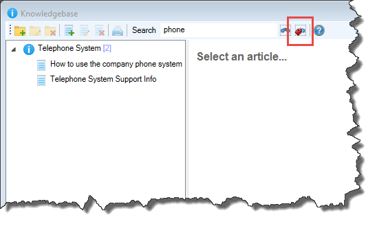 The main Knowledge Base view allows you to search for articles, view and print them, as well as manage and edit them.