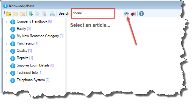 The list of articles on the left will be filtered down to only show Knowledge Base articles that contain the keyword that you searched for, or articles that have the keyword that you searched for in their title.