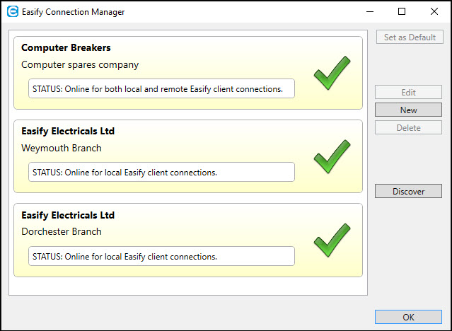 The Easify Connection Manager allows you to manage connections to your Easify Servers, and also allows you to automatically discover Easify Servers that do not yet appear in the Company Picker.