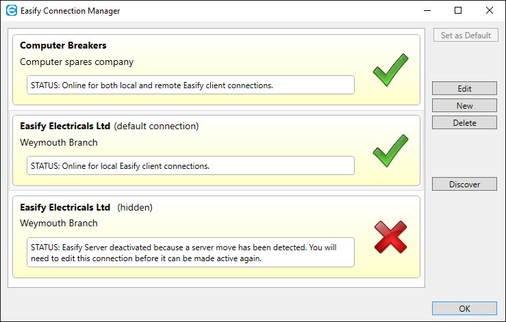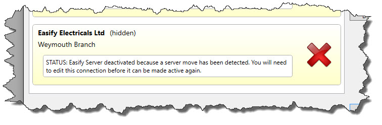 You can see that the third server is also shown as Easify Electricals Ltd - Weymouth Branch, but it has a large red cross on it and the status is "Easify Server deactivated because a server move has been detected...".