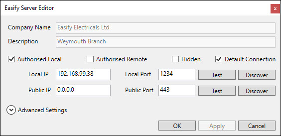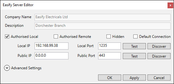 The Authorised Local checkbox determines whether the server is authorised to accept Easify Client connections on the local network. Typically this box is ticked to allow the Easify Server to communicate with clients on the local network.