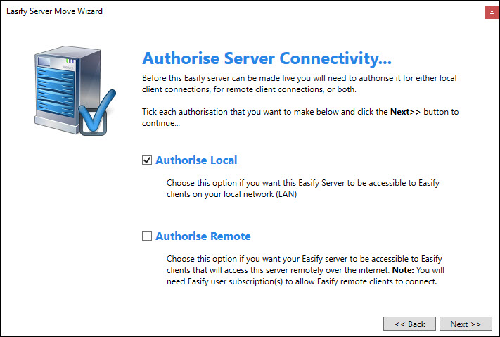 One of the side effects of a server detecting that it has been moved, is to de-authorise itself from local and remote connections. here you can choose whether to authorise local and/or remote connectivity.