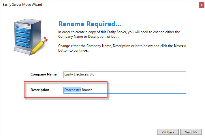 Since in this scenario we copied the Easify Electricals (Weymouth) database over the Easify Electricals (Dorchester) database, what we want to do is tell the Server Move Wizard that we want to repair this server by making it into a copy of the original server. In other words, we want to bring this server back online with a new identity (new company name or description).