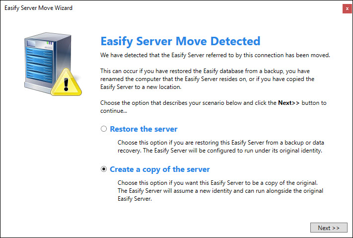 Select the Create a copy of the server option and click the Next >> button.