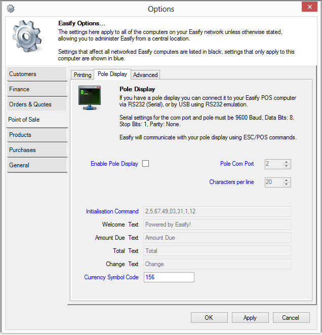 If you have an RS232 serial pole display connected to your POS tick Enable Pole Display to enable it.