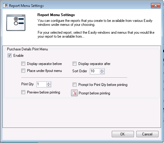 Purchases documents can be assigned to the Purchase Details Print Menu