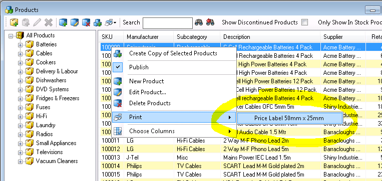 Products documents can be assigned to the Products Window Print Menu