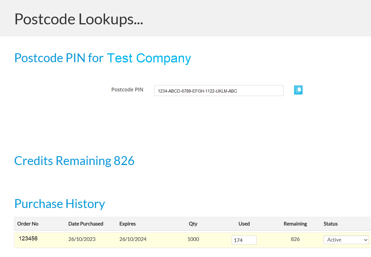 If you have purchased any Postcode Lookup Credits they will show in here, along with your Postcode PIN, your postcode order history, the status of the credits and how many you have left: