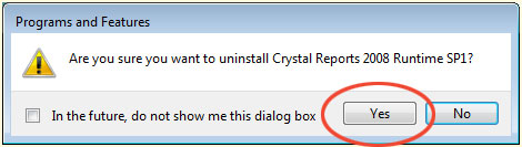 When asked to confirm that you wish to uninstall the Crystal reports 2008 Runtime, click the Yes button.