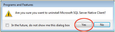 When asked to confirm that you wish to uninstall the Microsoft SQL Server Native Client, click the Yes button.