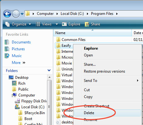 By this point you will have removed most of the components of Easify 2009, however there are a few files and folders that can be manually deleted.