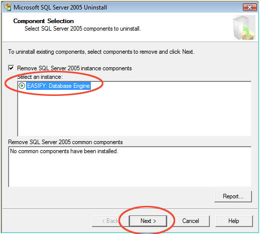 In the Microsoft SQL Server 2005 Uninstall dialogue select the instance named EASIFY: Database Engine. Note that if you have other SQL databases on your computer that use SQL 2005 they will be listed here. Make sure they are NOT selected, and that only the Easify instance is selected.