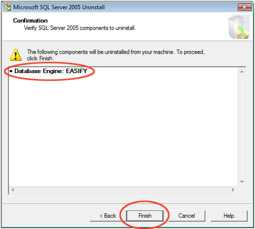 The next dialogue will summarise the databases that are to be removed, When you are happy that the only listed database is EASIFY click the Finish button.