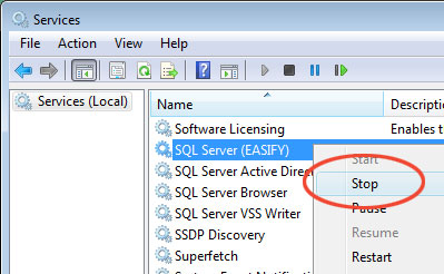 When the Services window opens, scroll down until you find the service named SQL Server (EASIFY). Right click the SQL Server (EASIFY) service and select Stop from the context menu.