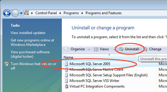 In the Programs and Features window select Microsoft SQL Server 2005, and click the Uninstall button.