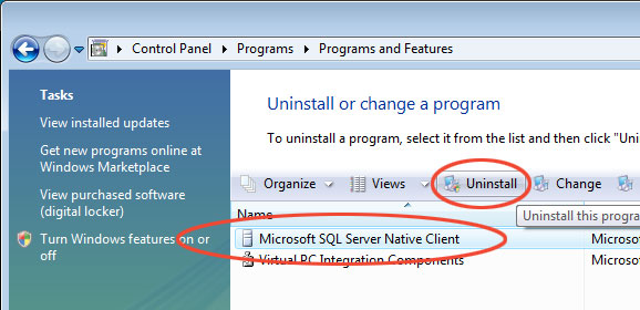 In the Programs and Features window select Microsoft SQL Server Native Client, and click the Uninstall button.